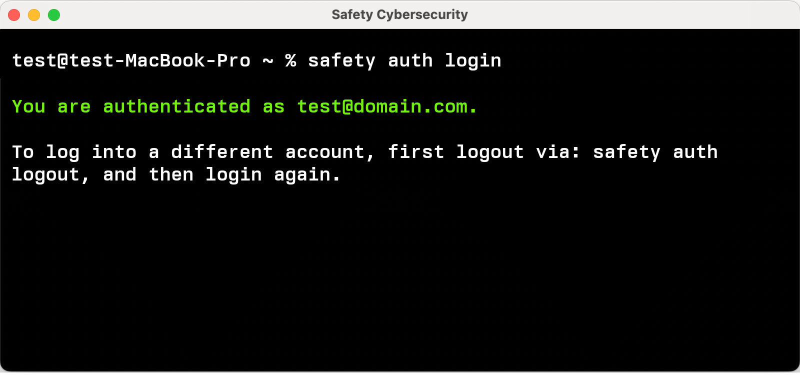 This will open a browser window where you can log in to your Safety account. Once authenticated, your terminal will show a success message.