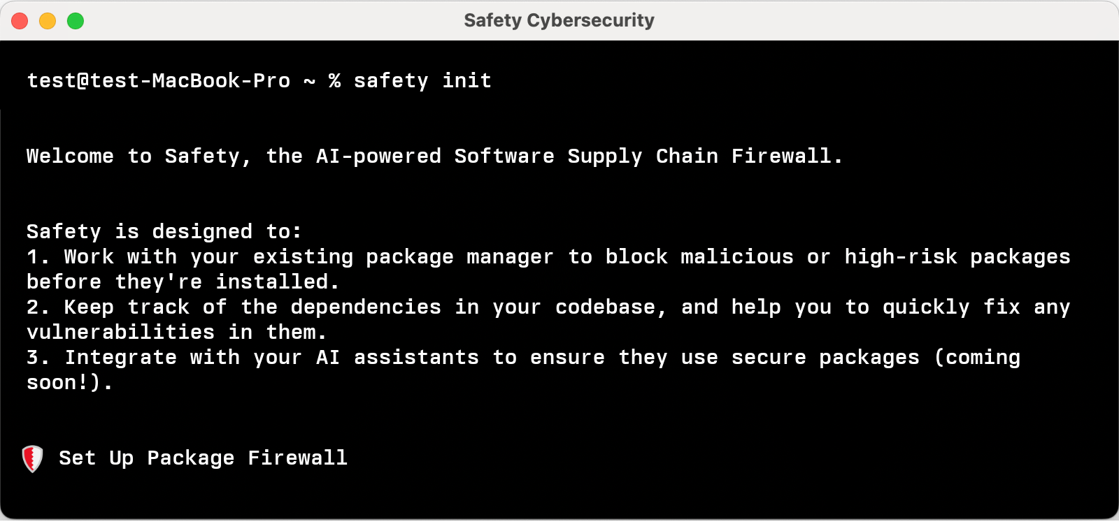 After installing the Safety CLI and authenticating your account, you can initialize Safety Firewall with a single command:
